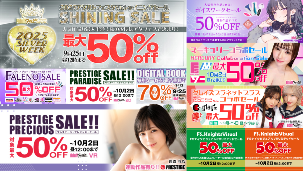 アダフェスの動画で最高の連休を! 先日始まったシャイニングセールをはじめ、プレステージ、FALENO、ボイス(アニメ系ASMR連動)、FS.KnightsVisualのコスプレ系動画、電... -