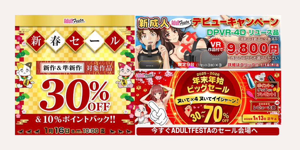 \アダフェスからのお年玉!/新作準新作を実質40%OFFでGETのチャンス! 2D,VR,連動作品600作品以上が対象に!激熱8KVRもこの機会にどうぞ! 期間限定今すぐ購入! ま... -