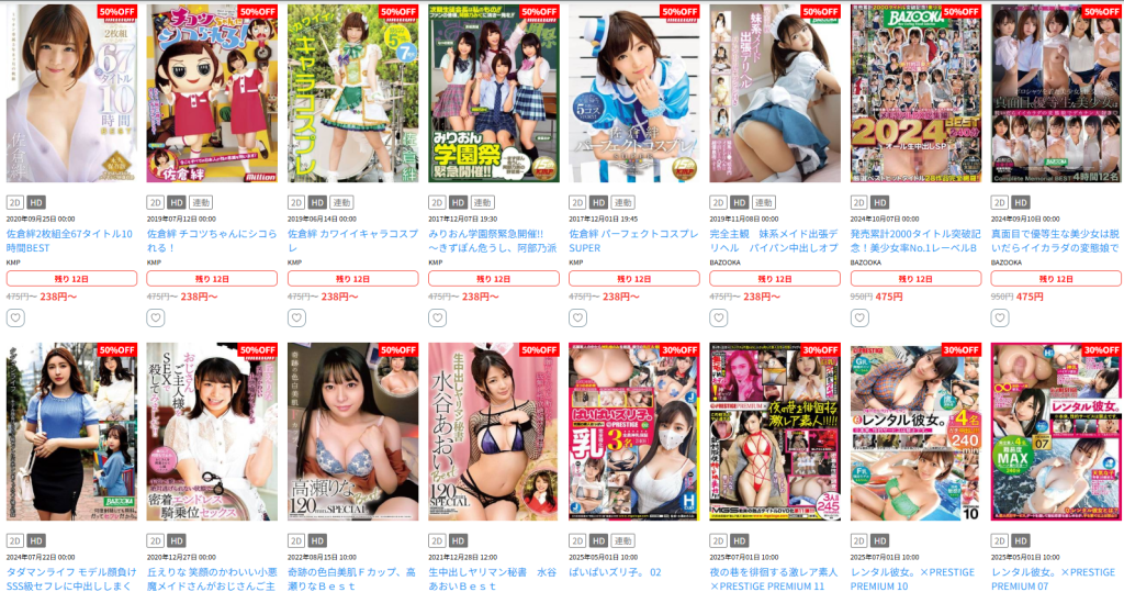 人気メーカープレステージ、ナチュラルハイ、素人作品まで最大半額大セール中!かわいいうさちゃん、どエロい猫ちゃん、メイドさんなどのコスプレをしたお姉さんが癒しを与えてくれます!