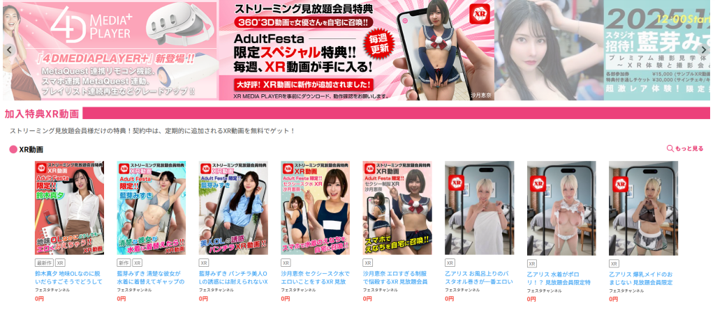 2D、VR、3D、XR作品をストリーミングで見放題!アダルトフェスタだけの連動対応動画も多数登録!